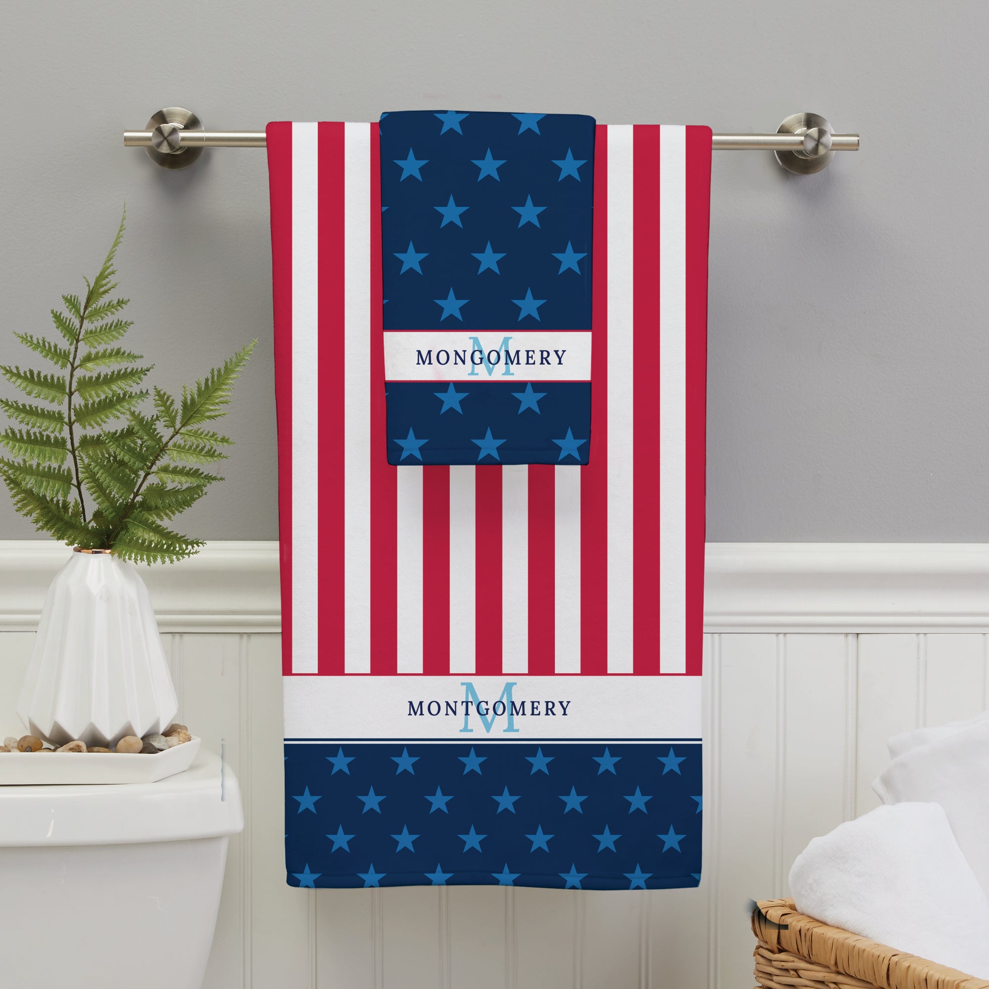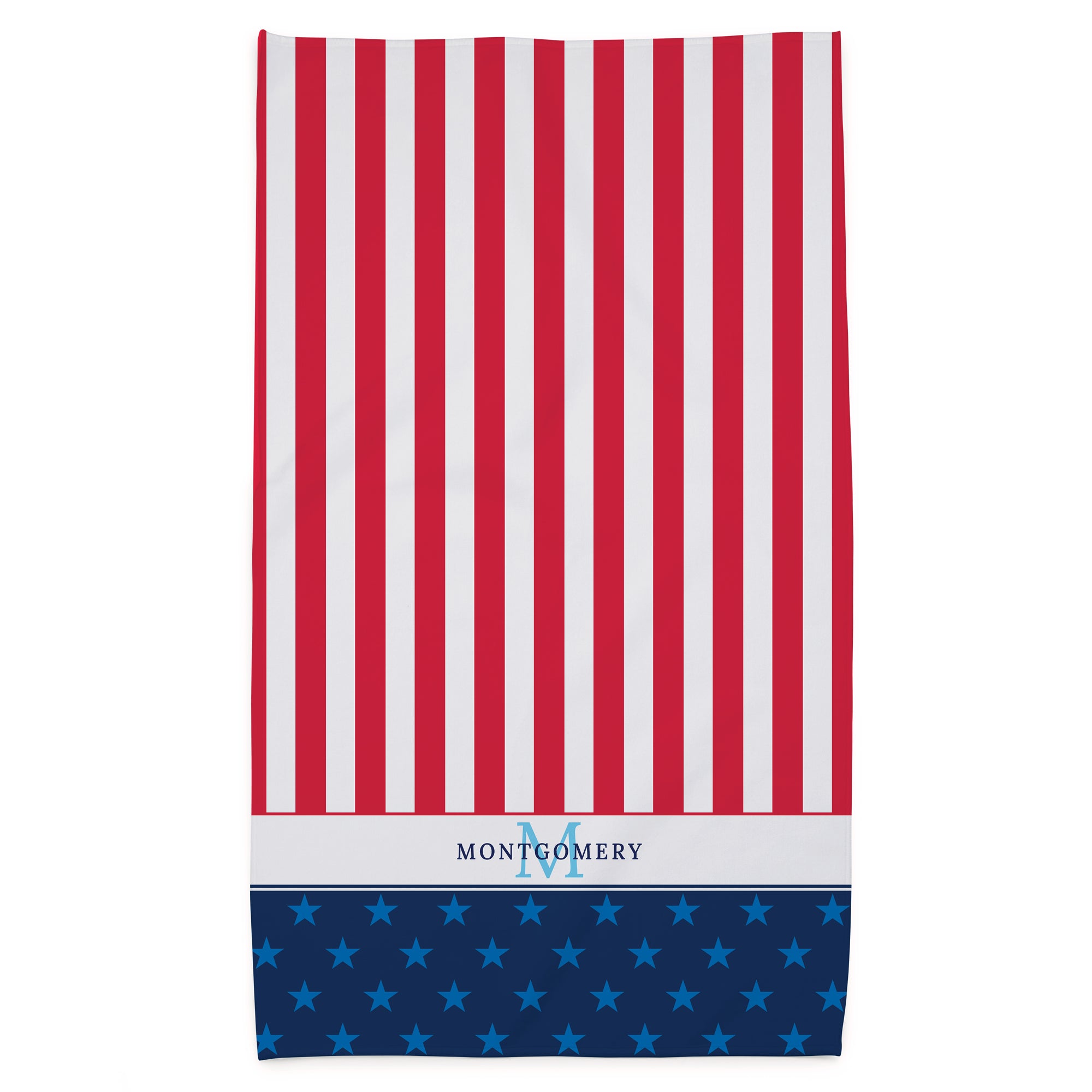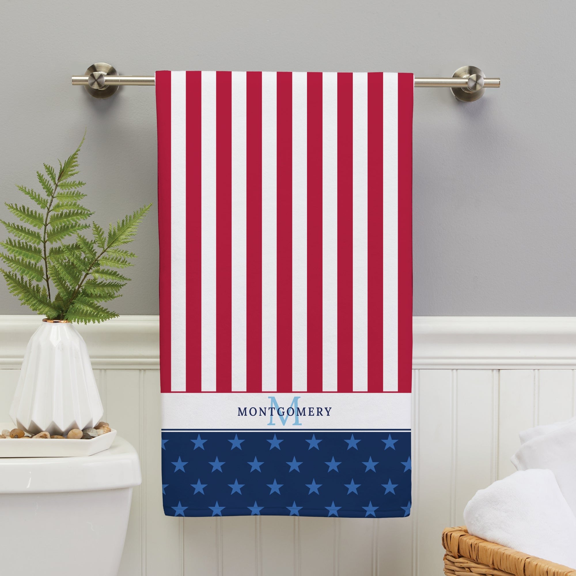 Bring a touch of American pride to your home with the Name and Initial Stars and Stripes Bath Towel. Featuring a bold, vibrant design inspired by the iconic American flag, this towel is perfect for adding a patriotic flair to your bathroom, pool, or beach outings.