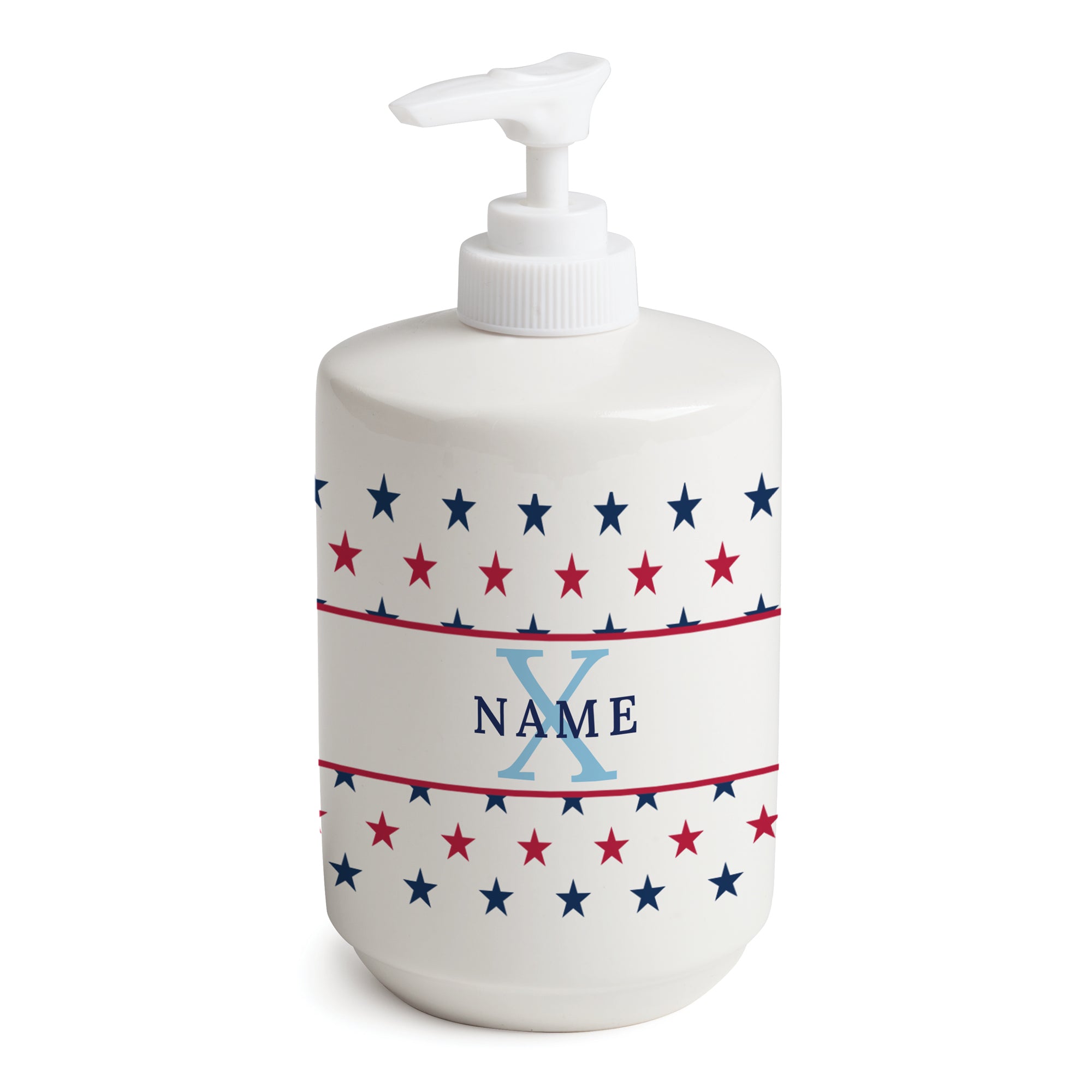 Elevate your bathroom or kitchen with the US Stars Ceramic Soap Dispenser, personalized with your name and initial. Featuring a bold, star-spangled design, this dispenser combines patriotic charm with everyday functionality.