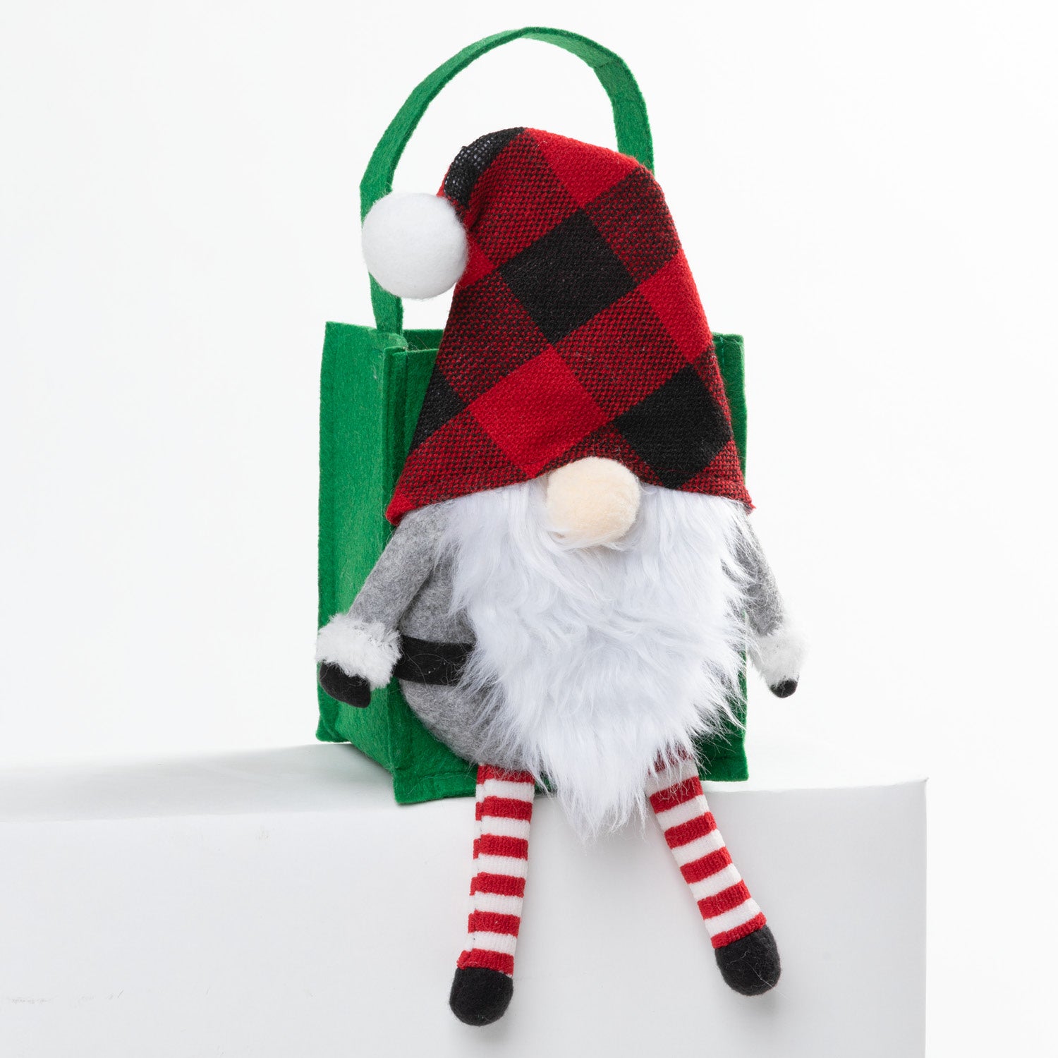 Add a whimsical touch to your gift-giving with this charming felt gnome gift bag. Featuring a playful black-and-red buffalo check hat and dangling red-and-white striped legs, this festive bag is as much a keepsake as the gift inside. Crafted from soft felt with sturdy handles, it’s the perfect size for small to medium presents, treats, or holiday surprises.